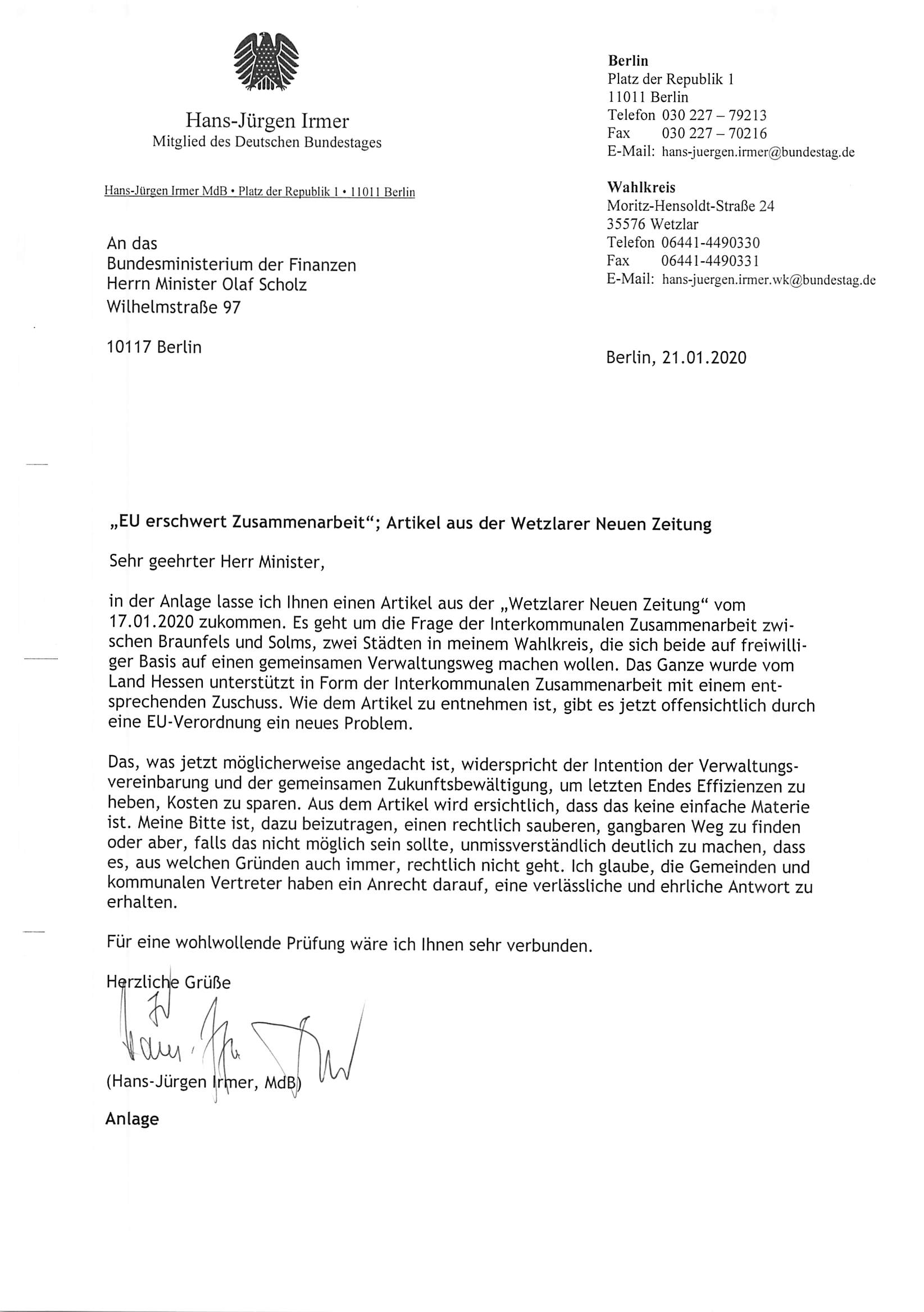 Nur vier Tage später ergriff unser heimischer CDU-Bundestagsabgeordneter Hans-Jürgen Irmer die Initiatitve und schrieb an Bundesfinanzminister Olaf Scholz. Er forderte den Minister auf dazu beizutragen, einen rechtlich sauberen Weg zu beschreiben, auf dem man die begonenene interkommunale Zusammenarbeit ohne Risiken fortsetzen könne.